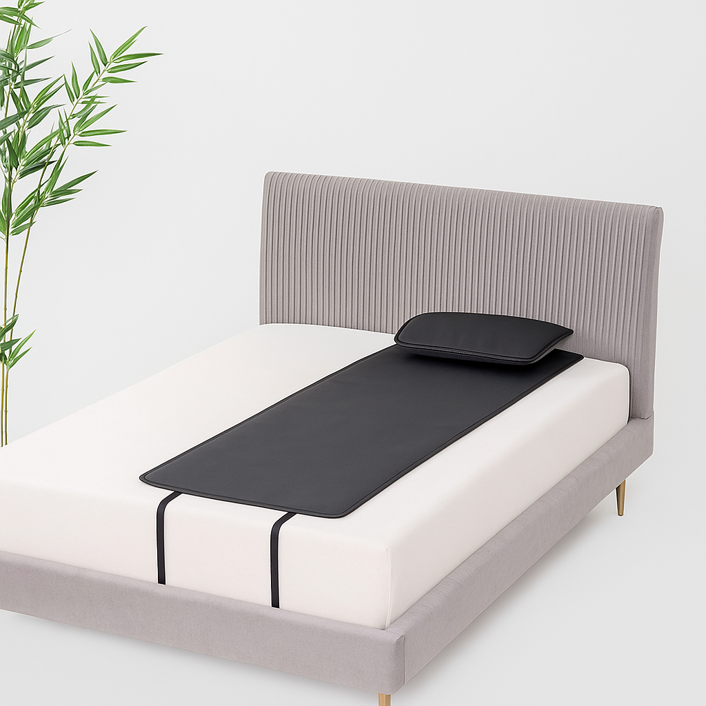 En premium earthing/grounding mat designad för att återkoppla din kropp till jordens naturliga energi medan du sover. Genom att ansluta mattan till jorden via ett vägguttag (med skyddsjord), hjälper den till att balansera kroppen, minska stress och förbättra återhämtning.