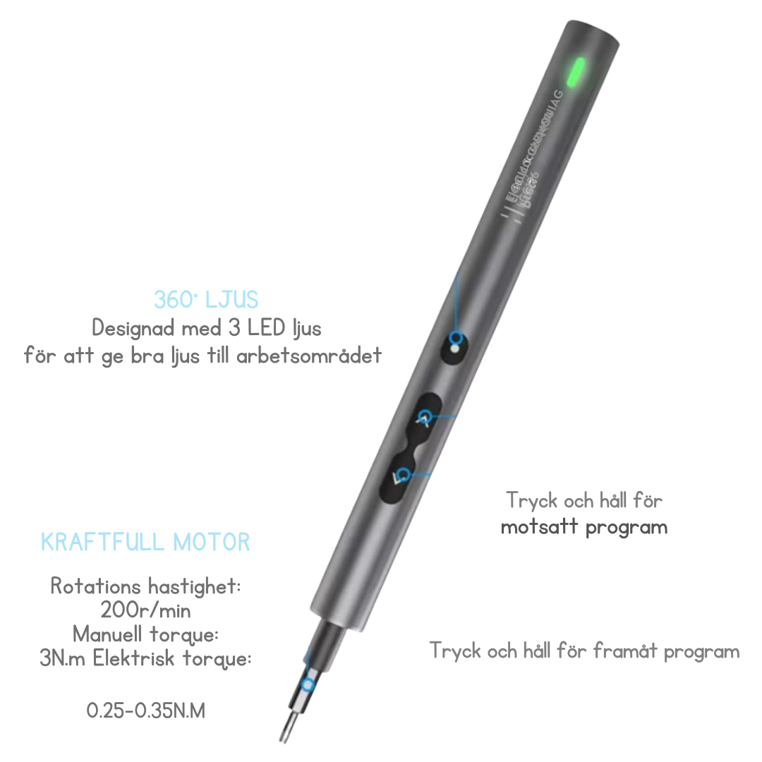 En lätt och elegant elektrisk skruvdragare perfekt för elektronik, glasögon, klockor, laptops, telefoner och andra småprojekt.